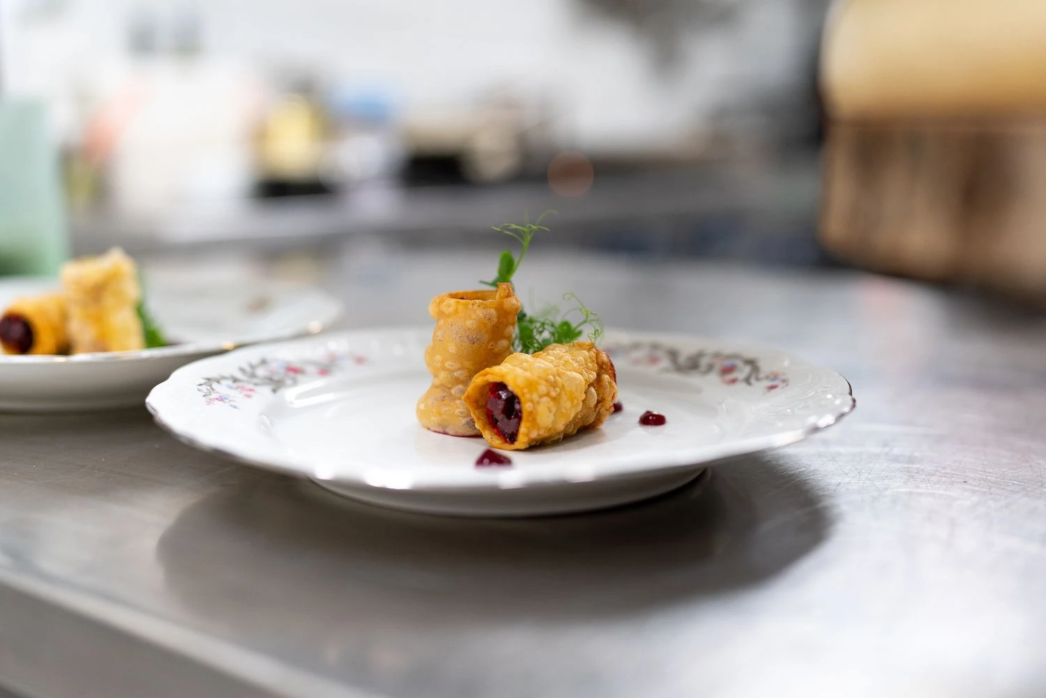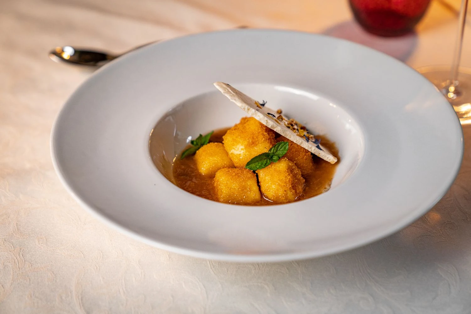 An old inn run by a young family, with music for the soul and an atmosphere designed for indulgence. Elegant white table settings beneath a noble old ceiling, surrounded by memories, firewood, cupboards, roses, and windowsills filled with bottles, harmoniously complement the beautifully designed plates and fine stemware.Specialties